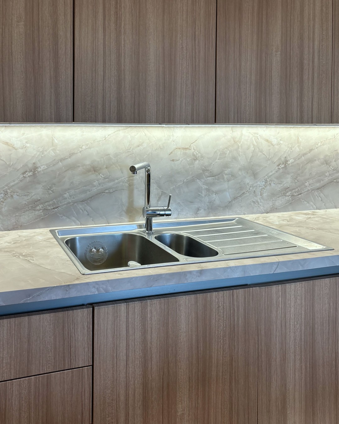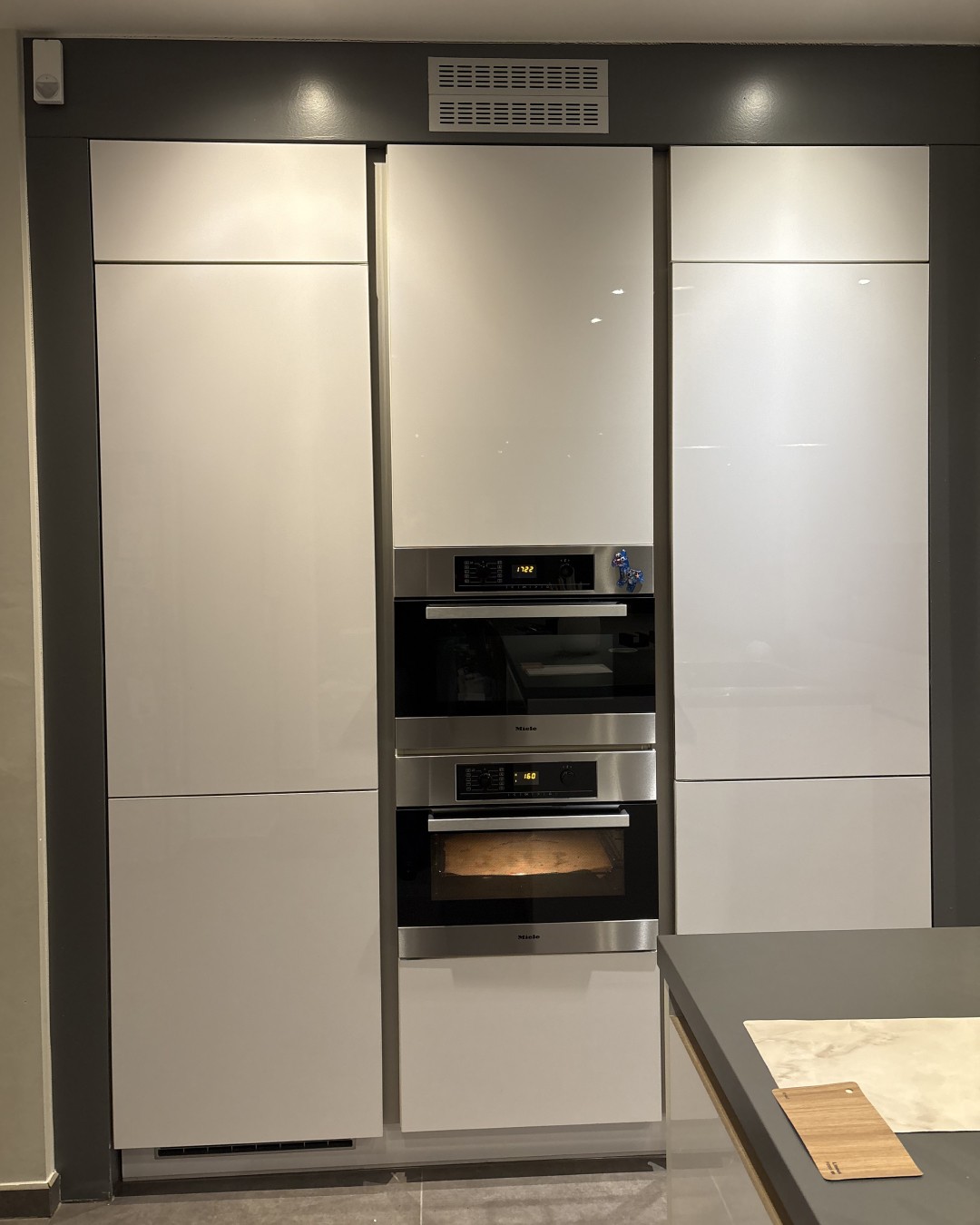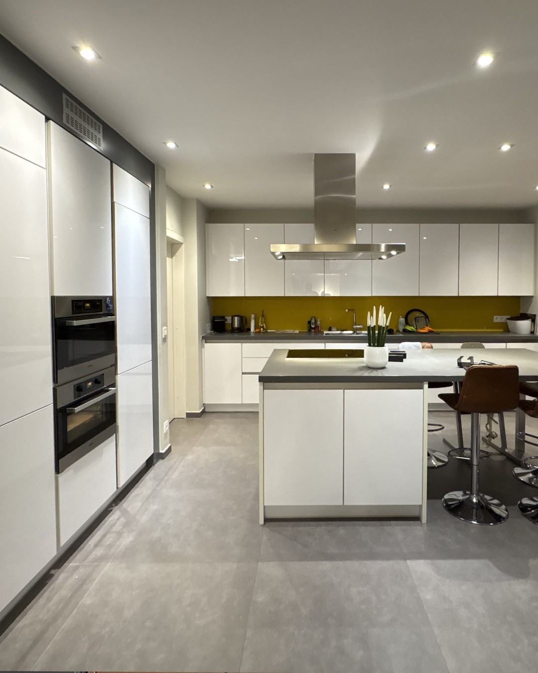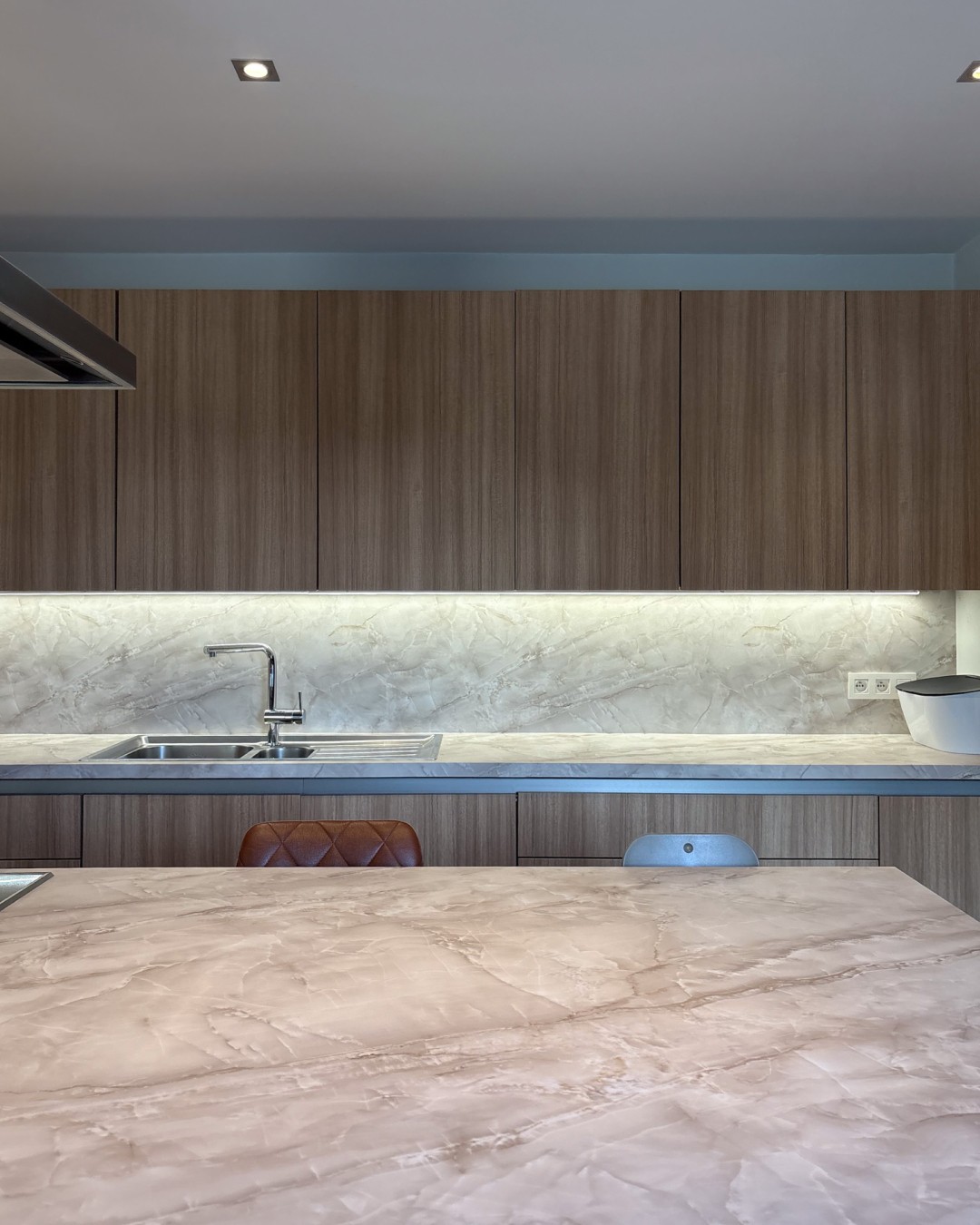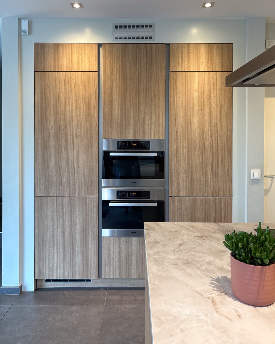 Deze keuken had een strakke, maar vrij koele uitstraling met hoogglans witte fronten en een donkere achterwand die weinig warmte gaf. Daarnaast liet het kantenband op sommige plekken los, wat de keuken een minder verzorgde look gaf. De klant miste sfeer en een meer natuurlijke uitstraling die beter aansluit bij de rest van het interieur. In plaats van alles te vervangen, kozen we ervoor om de keuken te wrappen en zo een warme, stijlvolle upgrade te geven met een compleet nieuwe uitstraling.